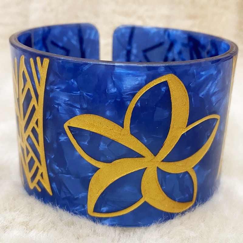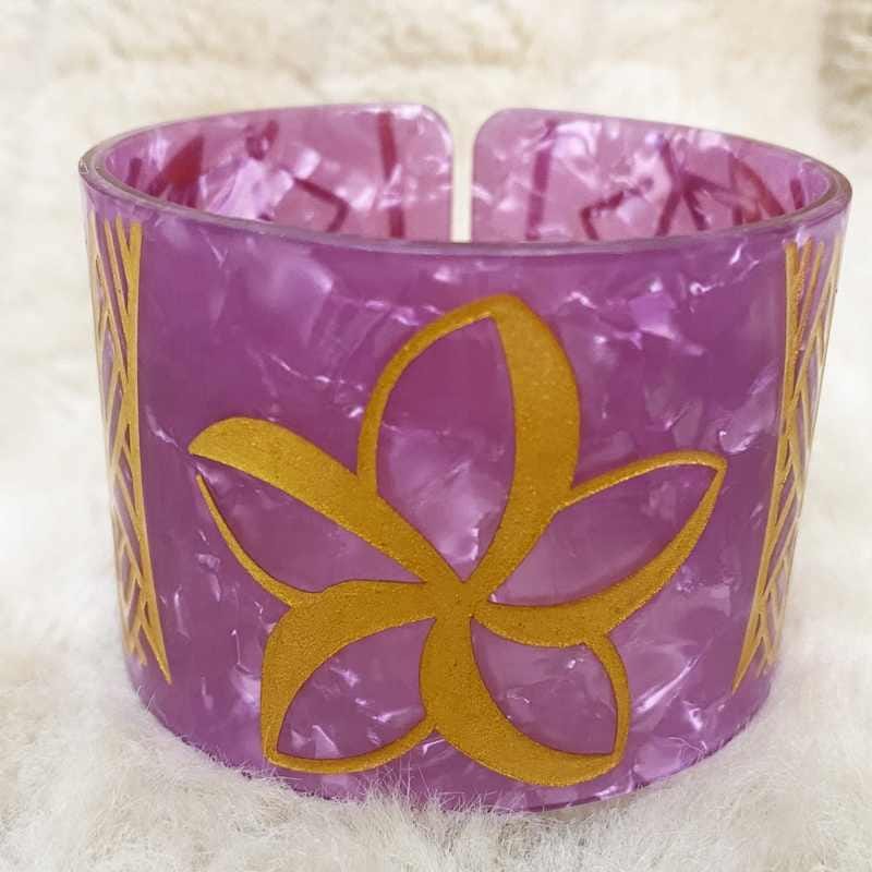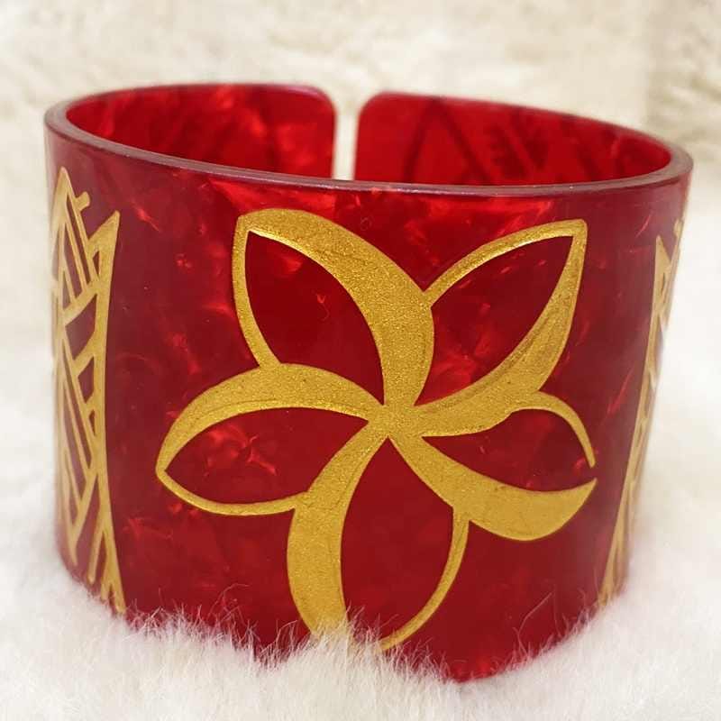 Celebrate Polynesian artistry with these stunning cuff bracelets. Crafted from durable acrylic, each bracelet features intricate carvings of the plumeria flower—symbolizing beauty and grace—combined with bold tribal designs.