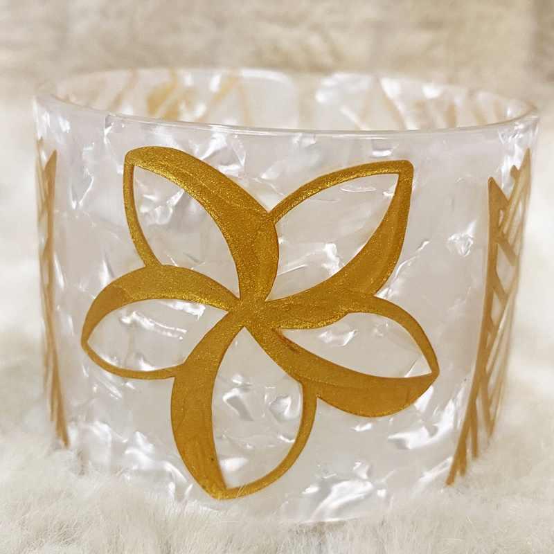 New Plumeria Floral w Tribal Carved Acrylic Cuff Bracelets Bangles – Polynesian Island Tribal Jewelry – 2.75″ Diameter x 2″ Width