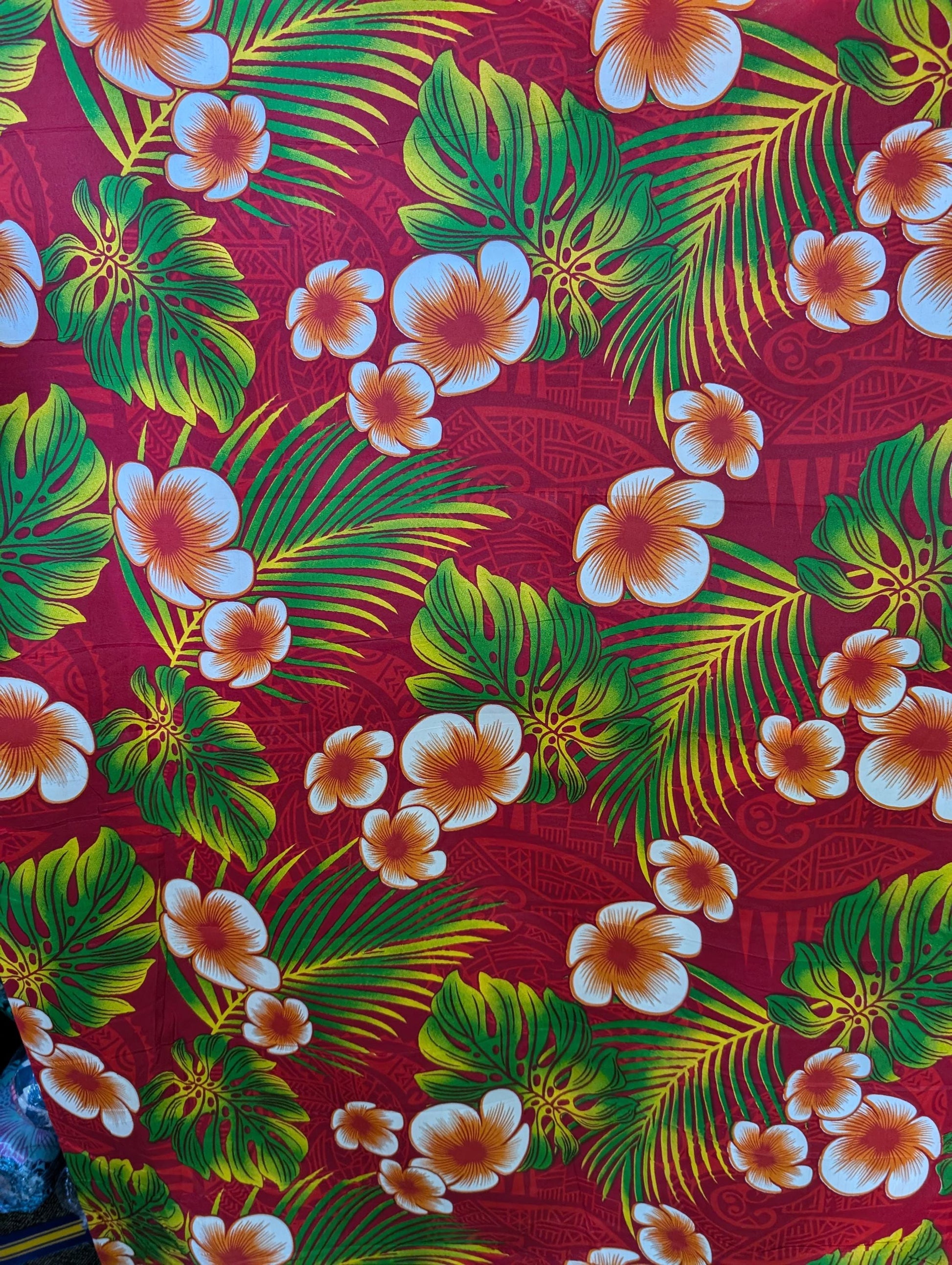This fabric is perfect for traditional wear, casual apparel, and home décor projects, bringing a touch of island elegance to your creations. Whether you're designing skirts, wraps, or accessories, this fabric is a must-have for those who love bold colors and cultural patterns.